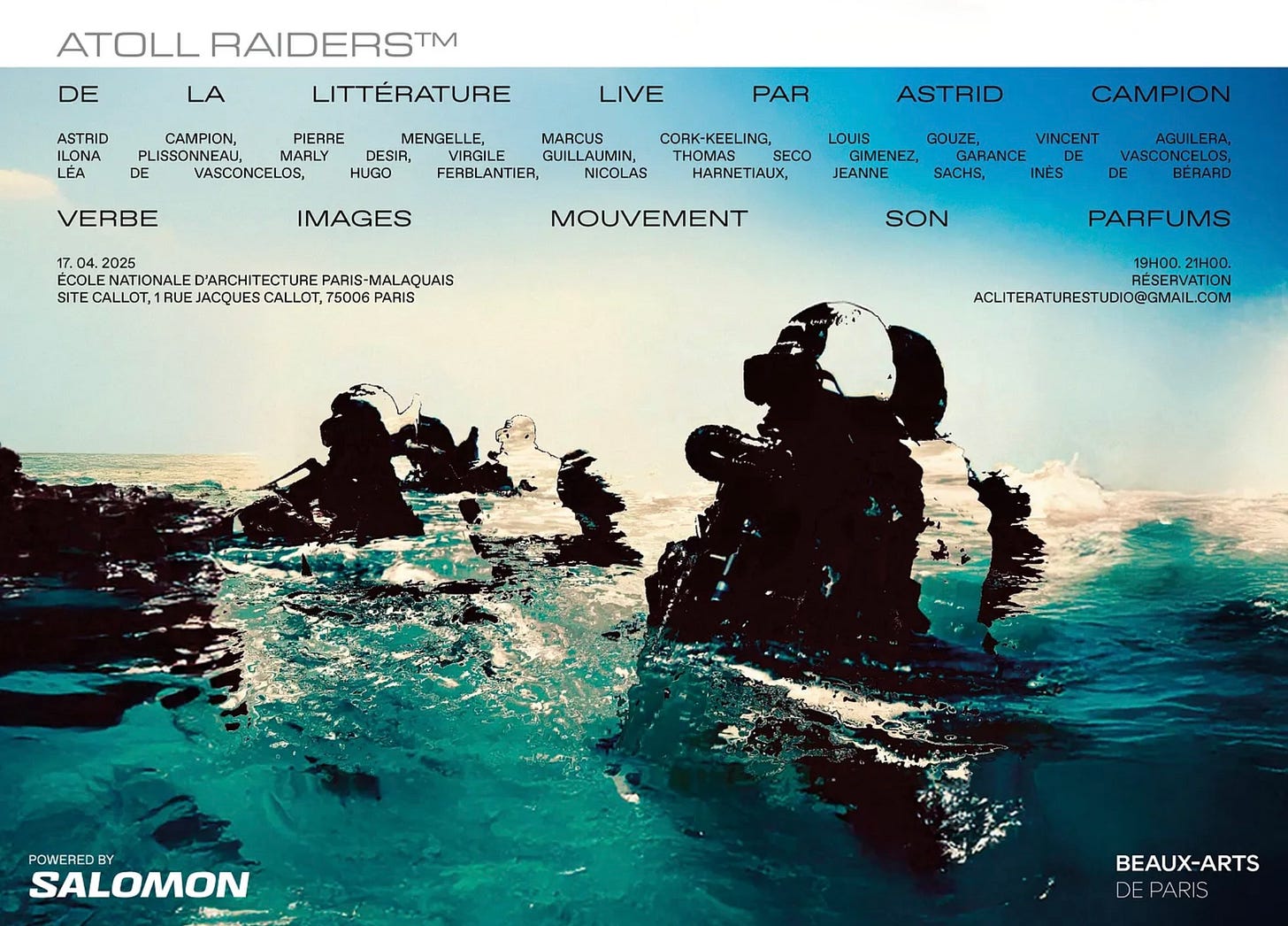 Initié en Avril 2024 par un appel à projet lancé à l’École Nationale Supérieure des Beaux-Arts de Paris, le projet Atoll Raiders™Live a pour intention première celle de dynamiser le champ contemporain de la littérature, de tester ses possibilités de résonance et d’amplification à l’ère d’une civilisation de l’hyperspectacle absorbée dans l’hélice de ses ambiguïtés exponentielles